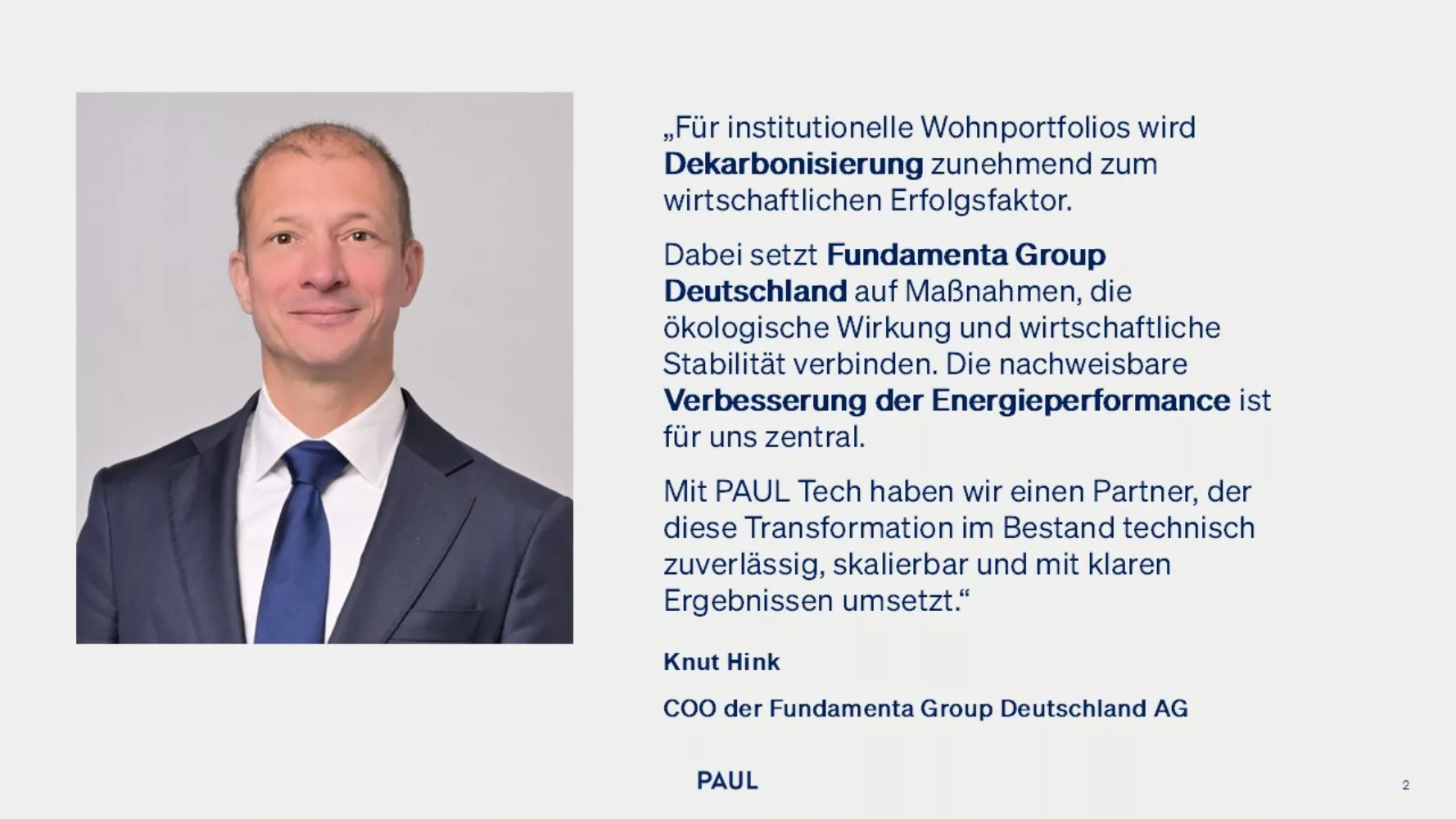 „Die Zusammenarbeit mit der Fundamenta Group Deutschland zeigt, wie Dekarbonisierung im Wohnbestand praktisch gelingt und die Wärmewende voranbringt. Mit PAUL Net Zero reduzieren wir Emissionen vermeiden, CO₂-Kosten und erhöhen die energetische Leistungsfähigkeit ganzer Portfolien. Das Pilotportfolio ist der Ausgangspunkt für eine Skalierung, die unserem Partner Planbarkeit und messbare Fortschritte ermöglicht.“
